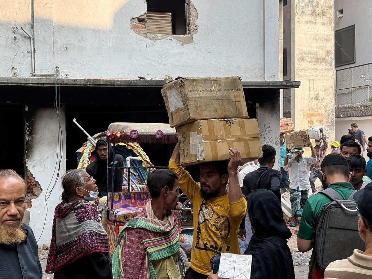 সরেজমিন দেখা গেছে, পেছনের ওই ছয়তলা ভবনে শত শত মানুষ ঢুকছেন। কেউ কেউ ভেতর থেকে জিনিসপত্র নিয়ে বেরিয়ে আসছেন। আর ভবনটির ভেতর থেকে হাতুড়ির আঘাতে নানা কিছু ভাঙার শব্দ শোনা যাচ্ছে।