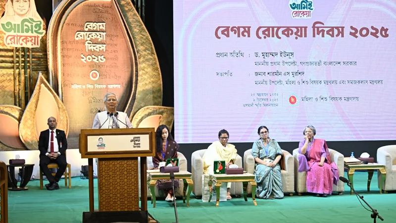 ১৯৭৪ সালের দুর্ভিক্ষের সময়ে চট্টগ্রাম বিশ্ববিদ্যালয়ের শিক্ষকতা ও গ্রামীণ ব্যাংকের শুরুর দিককার স্মৃতিচারণ করে নারীদের কঠিন সংগ্রামের কথা তুলে ধরেন প্রধান উপদেষ্টা। তিনি বলেন, ‘দুর্ভিক্ষের আঘাত প্রথমে আসে মেয়েদের ওপরে, শিশুদের ওপরে। আমরা দেখলাম, মেয়েরা জানে না তাদের নাম কী? সবাই চিনে, অমুকের মা, অমুকের স্ত্রী, অমুকের মেয়ে, নাতি-নাতনি। নাম জানে না। সমাজের একটা অংশ কীভাবে সমাজ থেকে নিজেকে বিচ্ছিন্ন করে ফেলে এটা তার নমুনা। আমরা নাম ঠিক করে দিলাম। নাম লিখতে শেখানোর জন্য হাতে কাঠি ধরিয়ে দিলাম। দিনরাত পরিশ্রম করে, চোখের পানি ফেলে তারা নাম লেখা শিখল… এটা ১০০ বছর পরের অবস্থা। ১০০ বছর আগে রোকেয়া সেই আমলে যে স্বপ্ন দেখেছে, সেটা বিশ্বাস করা যায় না। আজকে অনেকে বলে, “হ্যাঁ, সুন্দর কথা বলেছে…” সুন্দর কথা না, রোকেয়া বিপ্লবী কথা বলেছে। সমাজকে ঝাঁকুনি দিয়ে কথা বলেছে। কিন্তু সেই ঝাঁকুনি বহন করে নিয়ে যাওয়ার মতো ব্যক্তি আর এলো না। এটাই আমাদের দুর্ভাগ্য।’